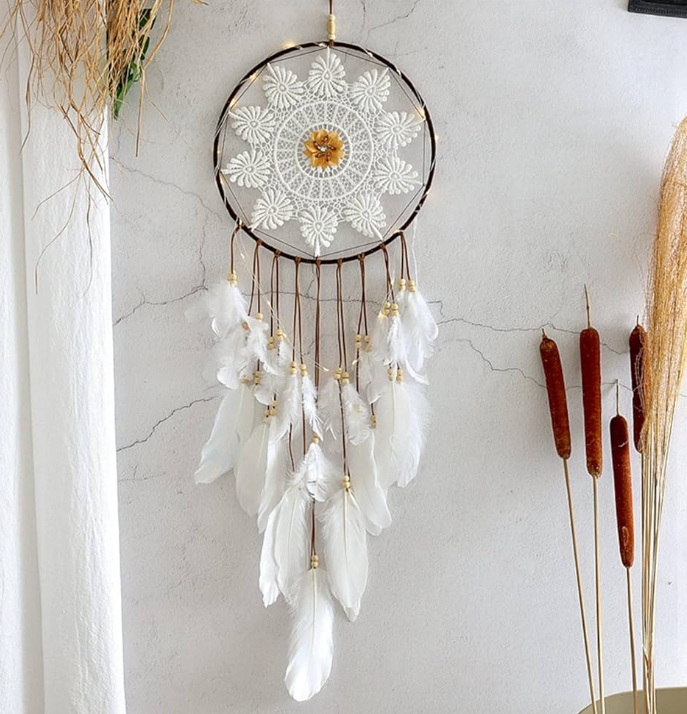 Attrape-rêves neuf, idéal pour décorer votre chambre, salon ou espace de détente. Inspiré de la tradition amérindienne, il est conçu pour apporter une touche bohème et apaisante à votre intérieur. Avec ses plumes et ses perles délicates, il crée une décoration murale élégante et originale.